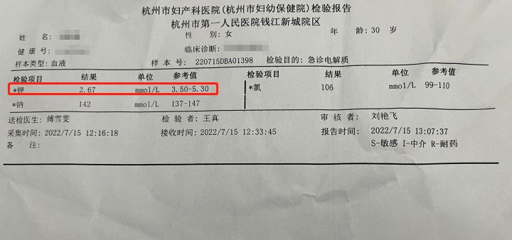术前检查发现马女士的血钾值为2.67mmol/L,远低于正常水平,为中度低钾血症!